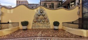 A terasz az épület gyöngyszeme, ami a különböző színes csempékből készült homlokzatáról ismert. Középpontjában a négy görbe kémény áll, amelyek a visszahuzat elkerülése végett épült.